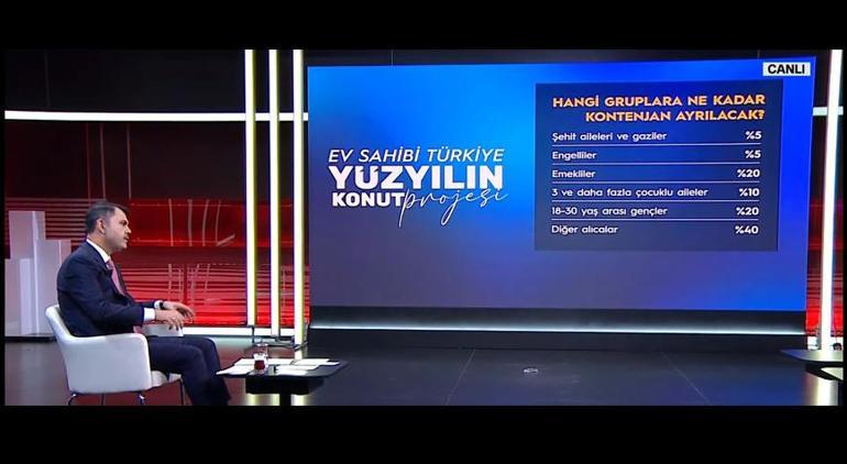 Çevre, Şehircilik ve İklim Değişikliği Bakanı Murat Kurum, Yüzyılın Konut Kampanyası’nın detaylarını CNN TÜRK’te duyurdu. Bakan Kurum’un açıklamalarından satır başları şu şekilde: Cumhuriyet tarihimizin en büyük sosyal konut projesini duyurduk. Ev Sahibi Türkiye projesini milletimize armağan ettik. Bu çok büyük proje, 81 ilde hem konut fiyatları hem de kira fiyatlarını düşürmek amacıyla gerçekleştirdiğimiz bir projedir. İstanbul’da 100 bin konut, vatandaşlarımıza sunulacaktır. Evi olmayan her Türkiye Cumhuriyeti vatandaşı bu projeye başvurabilir.