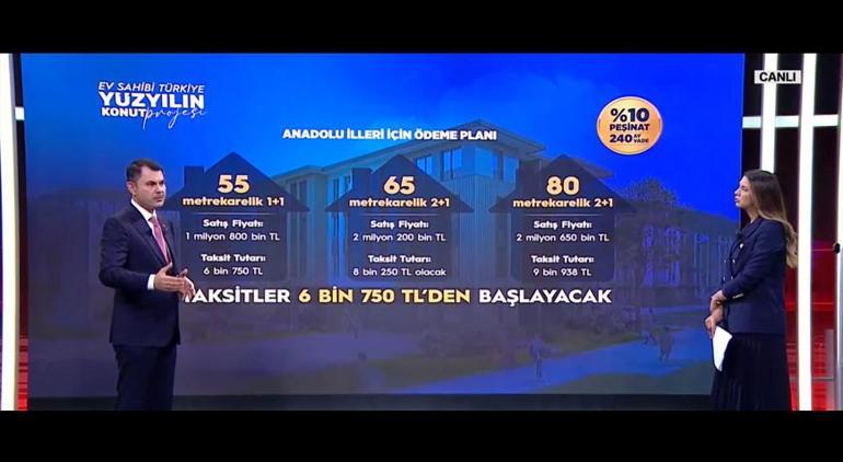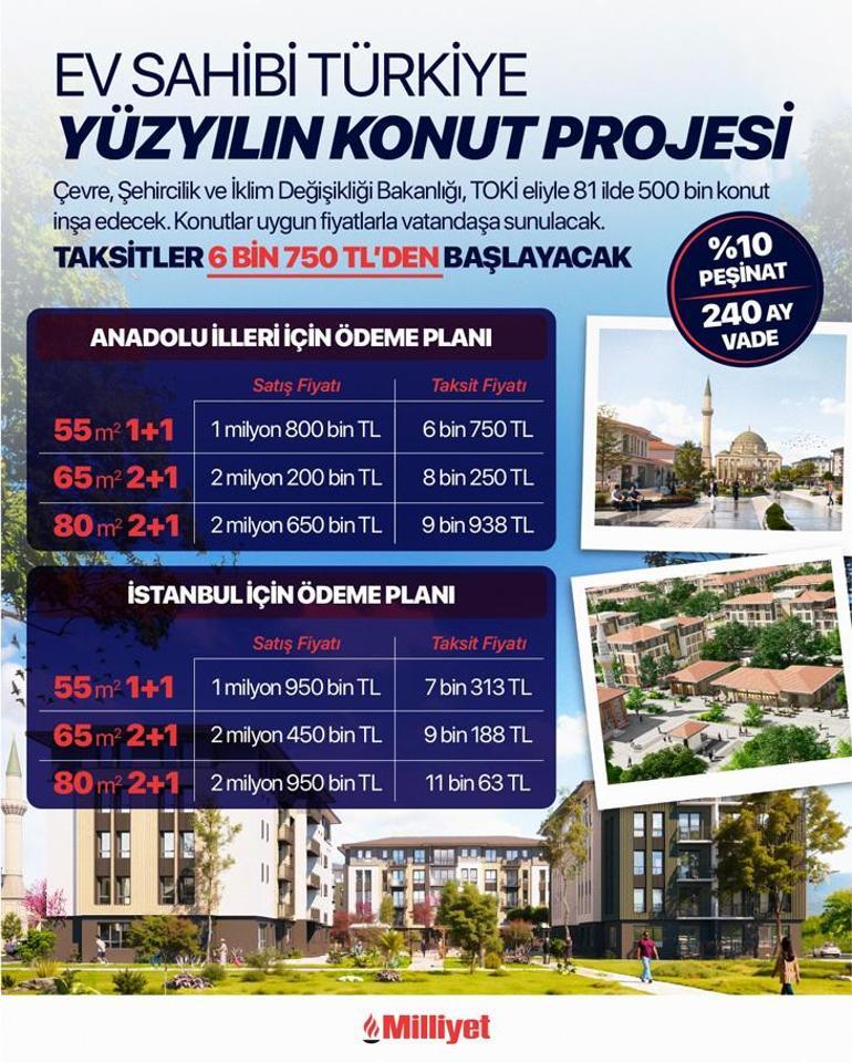 Anadolu’da 55 metrekarelik 1+1 evler 1 milyon 800 bin TL’den, taksit tutarı 6 bin 750 TL’den satışa sunulmaktadır. 65 metrekarelik 2+1 evler ise 2 milyon 200 bin TL’den, taksit tutarı ise 8 bin 250 TL’den satışa sunulmaktadır. 80 metrekarelik 2+1 evler ise 2 milyon 650 bin TL’den, taksit tutarı 9 bin 938 TL’den satışa sunulmaktadır. Yüzde 10 peşinat ve 240 ay vade ile ev sahibi olunabilecektir. Vatandaşlarımız kira değil, aidat öder gibi ev sahibi olacaklardır.