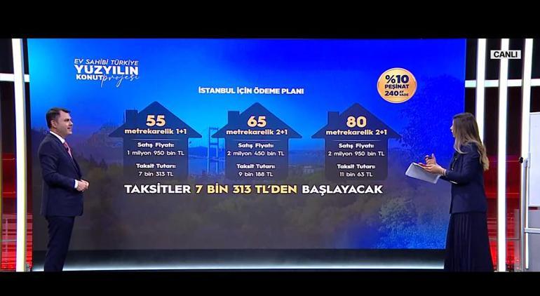 Proje duyurulduğunda ‘Yapılamaz, başaramazlar’ diyenler olmuştu. Ancak şu an geldiğimiz noktada, 23 yılda tam 1 milyon 700 binden fazla konut inşa ettik. Bu konutlarla birlikte, aileleriyle birlikte 5 milyonu aşkın vatandaşımıza ev sahibi olmalarını sağladık. 10 Kasım’da başvurular başlayacaktır. İstanbul’da 240 ay vadeli 7 bin 313 lira taksit ödeyecekler ve 6 ayda bir memura yapılan zamlar kadar artış olacaktır.