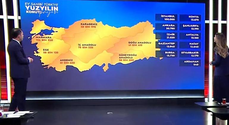 7 farklı bölgeye ayrılmış olan konut planında; Marmara Bölgesi’ne 156 bin 920, Ege’ye 58 bin 120, Akdeniz’e 61 bin 660, Karadeniz’e 38 bin 970, İç Anadolu’ya 78 bin 330, Doğu Anadolu’ya 41 bin 410 , Güneydoğu Anadolu’ya 58 bin 880 konut yapılacaktır. İstanbul’a 100 bin, Ankara’ya 30.780, İzmir’e 21.520, Gaziantep’e 13.940, Bursa’ya 13.730, Konya’ya 13.670, Şanlıurfa’ya 13.190, Antalya’ya 13.160, Hatay’a 12.640, Diyarbakır’a 12.170, Ardahan’a ise 540 konut inşa edilecektir.