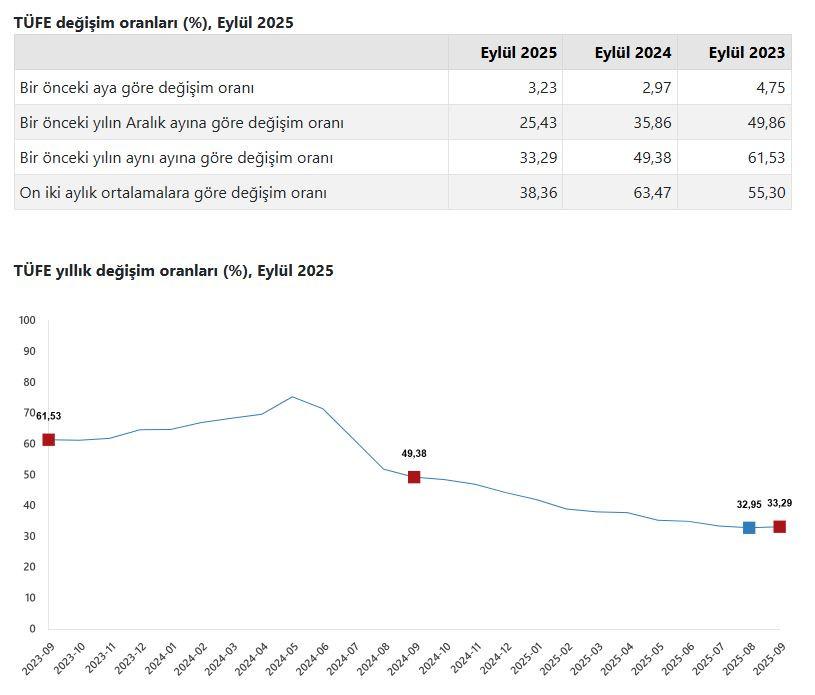Türkiye İstatistik Kurumu (TÜİK), tüketici enflasyonunun Eylül ayında yıllık yüzde 33,29, aylık yüzde 3,23 olduğunu açıkladı.