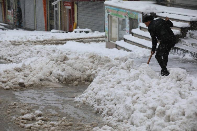 Kar nedeniyle beyaza bürünen Başkale’de vatandaşlar, iş yerlerinin önünde ve araçların üzerinde biriken karı temizledi.