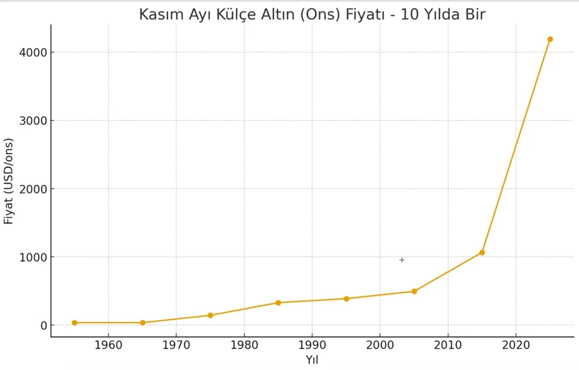 Altın fiyatlarına uzun dönemli bakmak gerekir. Onar yıllar içinde olarak bakarsak, bu onar yıllar içinde iniş-çıkışlar var ve fakat trend hep artış yönünde olmuştur. (Aşağıdaki tablo ve grafik)