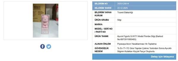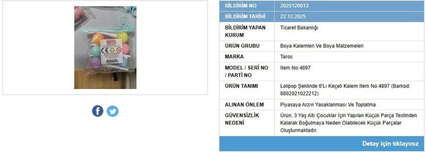 Bakanlık tarafından yapılan açıklamada, güvensiz olarak tespit edilen kırtasiye ürünlerinde, boğulmaya neden olabilecek küçük parçalar oluştuğu belirtildi.